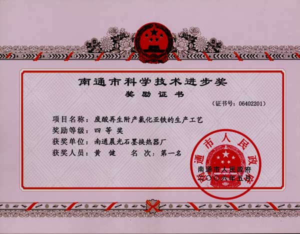 廢酸再生附產(chǎn)氯化亞鐵的生產(chǎn)工藝,榮獲南通市科學(xué)技術(shù)進(jìn)步獎(jiǎng),四等獎(jiǎng)