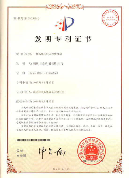 發(fā)明專利 :一種石墨反應(yīng)釜的攪拌機(jī)構(gòu) 專利號(hào):ZL 2015 1 0175525.3