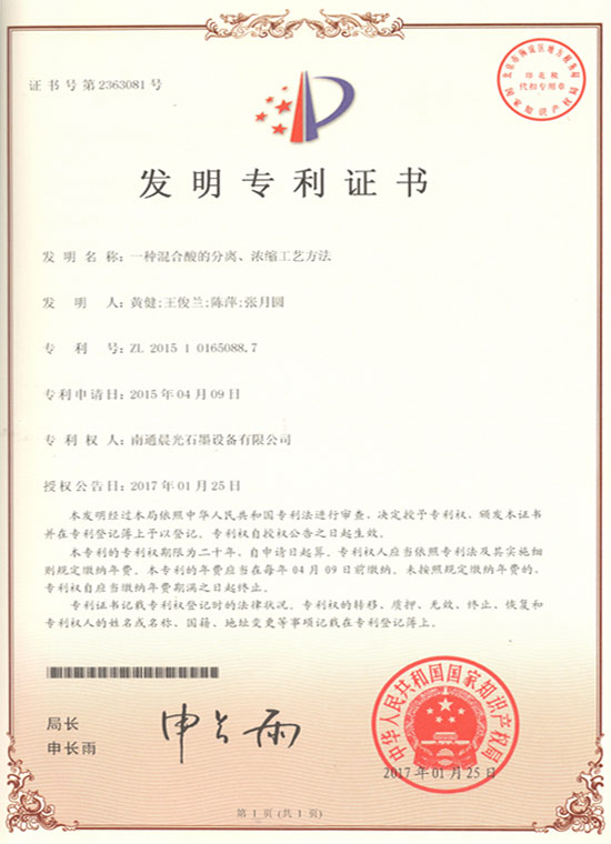 發(fā)明專利:一種混合酸的分離、濃縮工藝方法 專利號(hào):ZL 2015 1 0165088.7