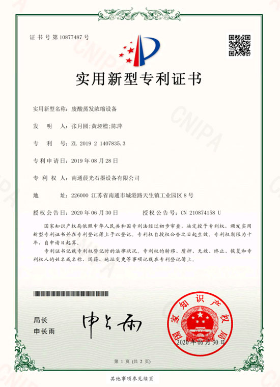 實(shí)用新型專利 :廢酸蒸發(fā)濃縮設(shè)備 專利號(hào):ZL 2019 2 1407835.3
