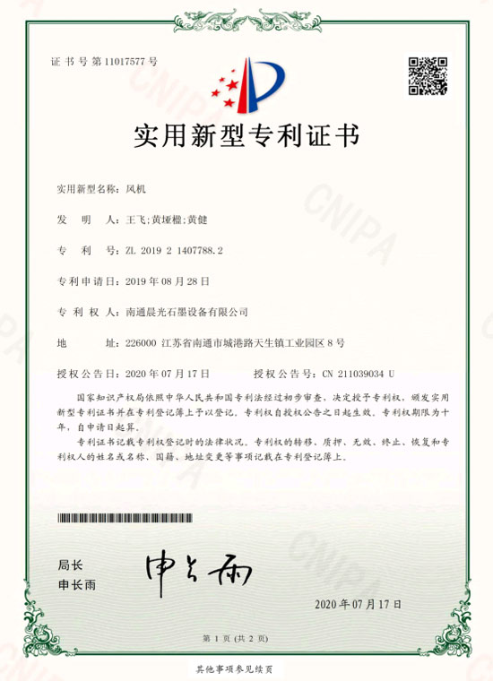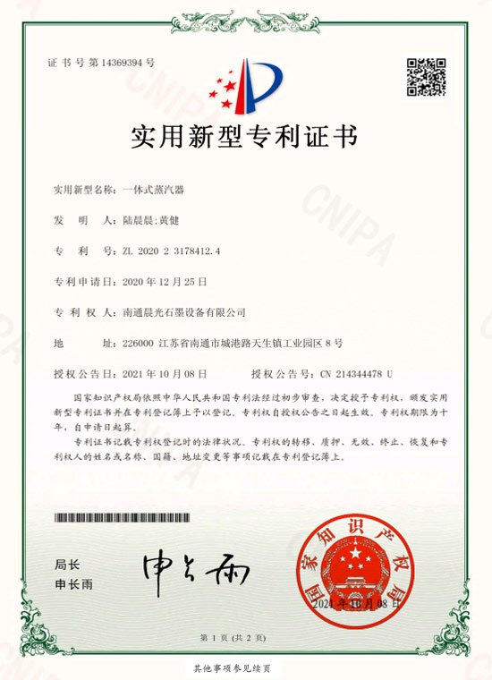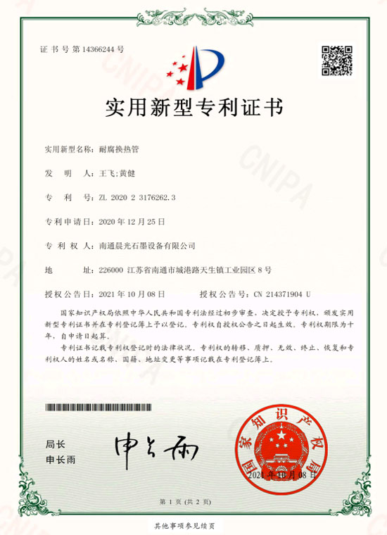 實(shí)用新型專利 :石墨換熱器 專利號(hào):ZL 2019 2 1407837.2