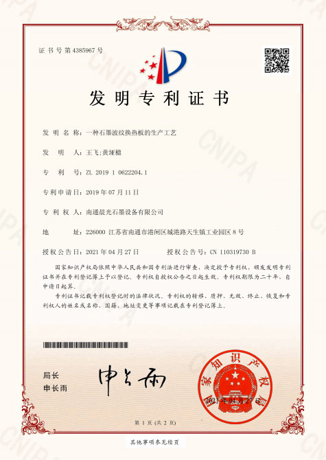 發(fā)明專利:一種石墨波紋換熱板的生產(chǎn)工藝 專利號(hào):ZL 2019 1 0622204.1
